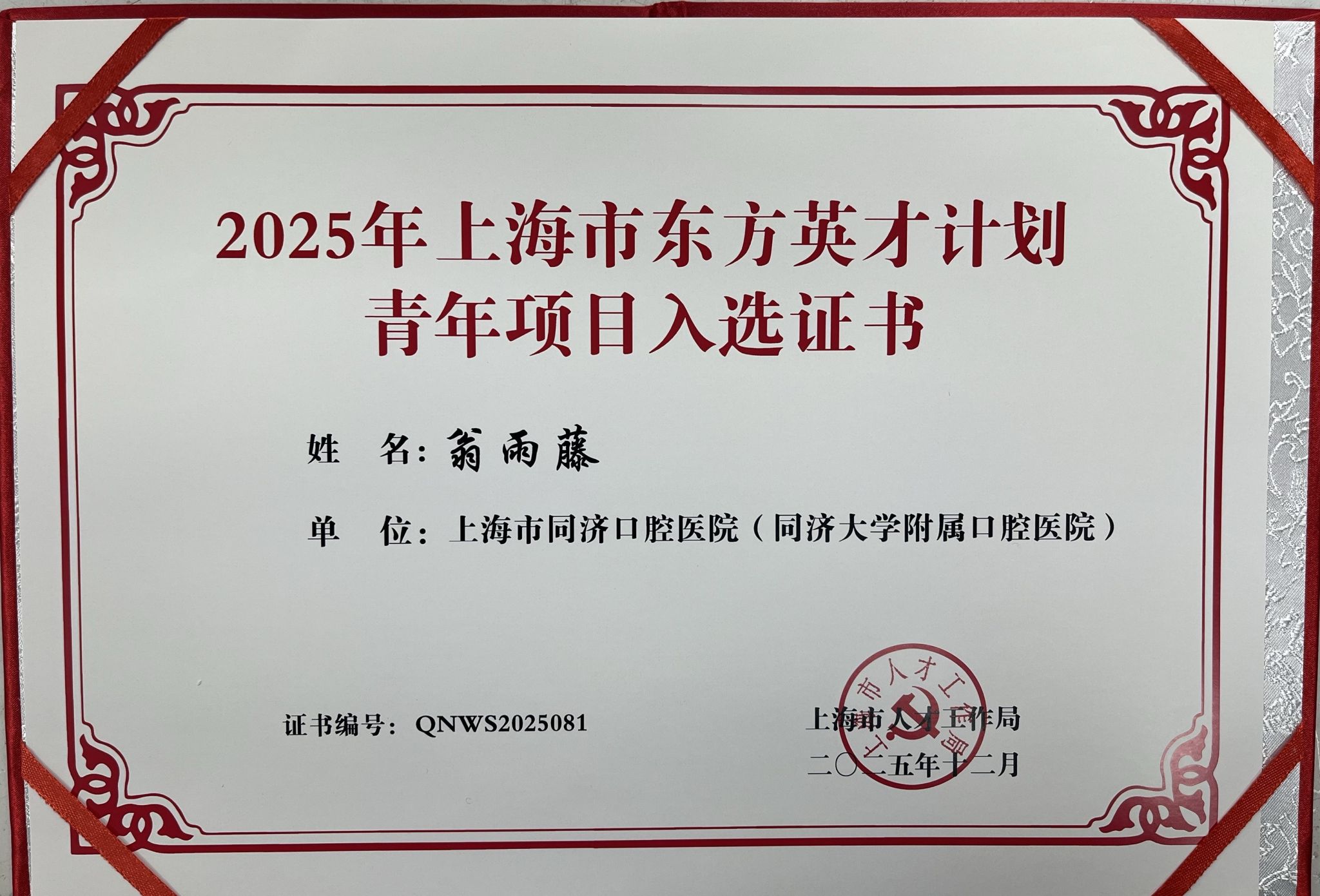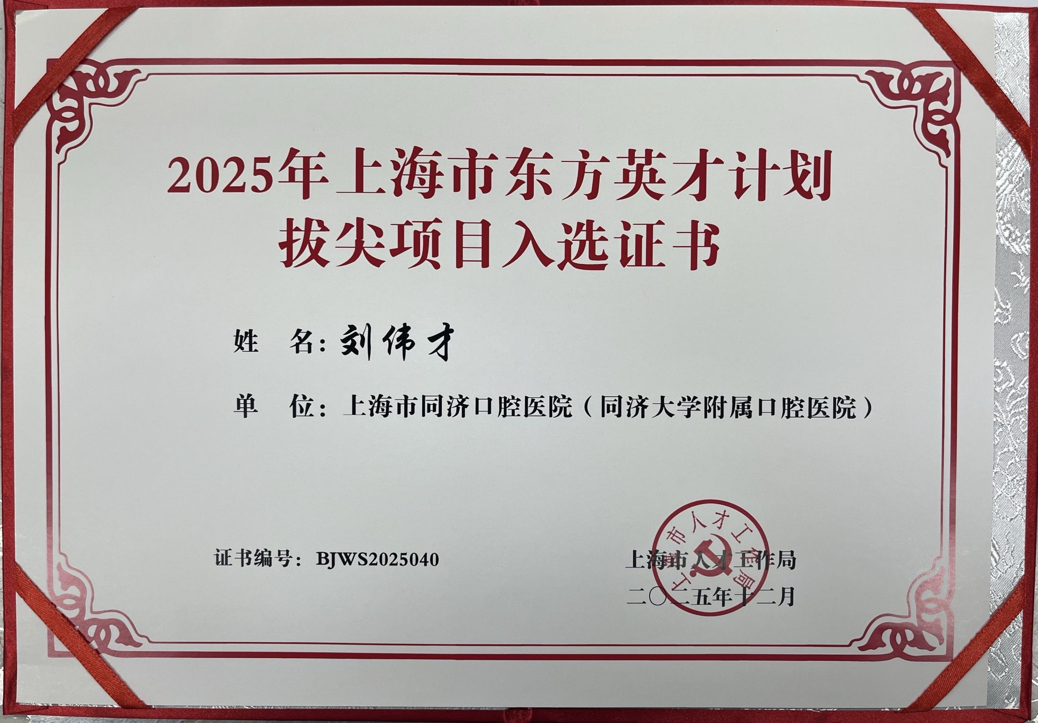 根据《上海市人才计划管理办法》、《关于开展2025年东方英才计划拔尖、青年项目卫生平台申报评审工作的通知》,经个人申报、逐级推荐、专家评审等程序,kaiyun开云官网数字化诊疗中心刘伟才主任与口腔种植科翁雨藤医师分别入选2025年上海市东方英才计划拔尖项目与青年项目(卫生平台)。